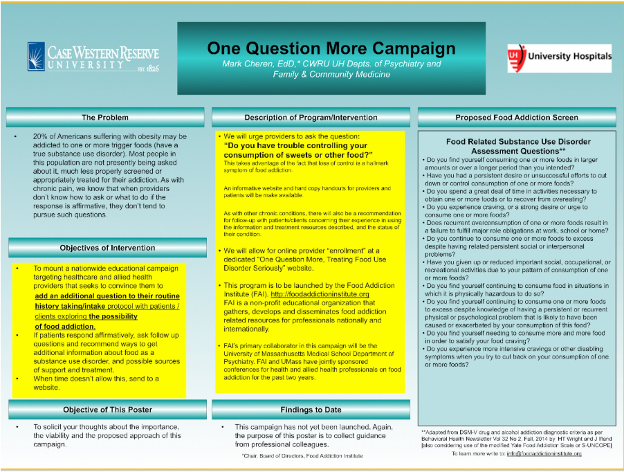 Allies of the institute are already engaged with those institutions on winning recognition. But the institute believes enough evidence for one or more food-related substance use disorders already exists to urge health care professionals to add one more question to their intake protocol: “Do you have trouble controlling your weight, eating, and/or consumption of sweets and other food?”